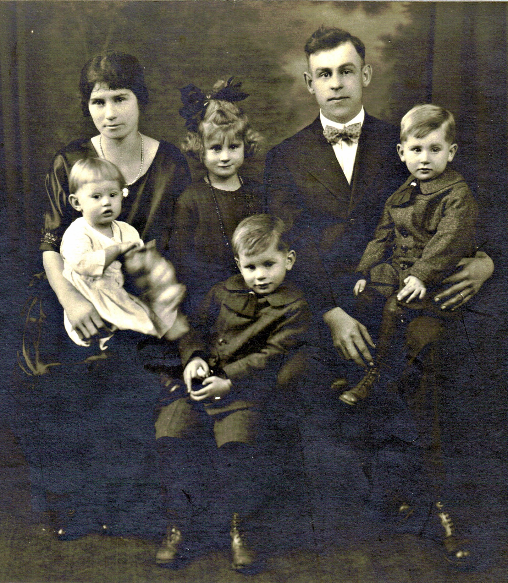 The children in front from L to R: Gerald [my grandpa, b. 1921], Walter [b. 1918], and Joseph [b. 1919]